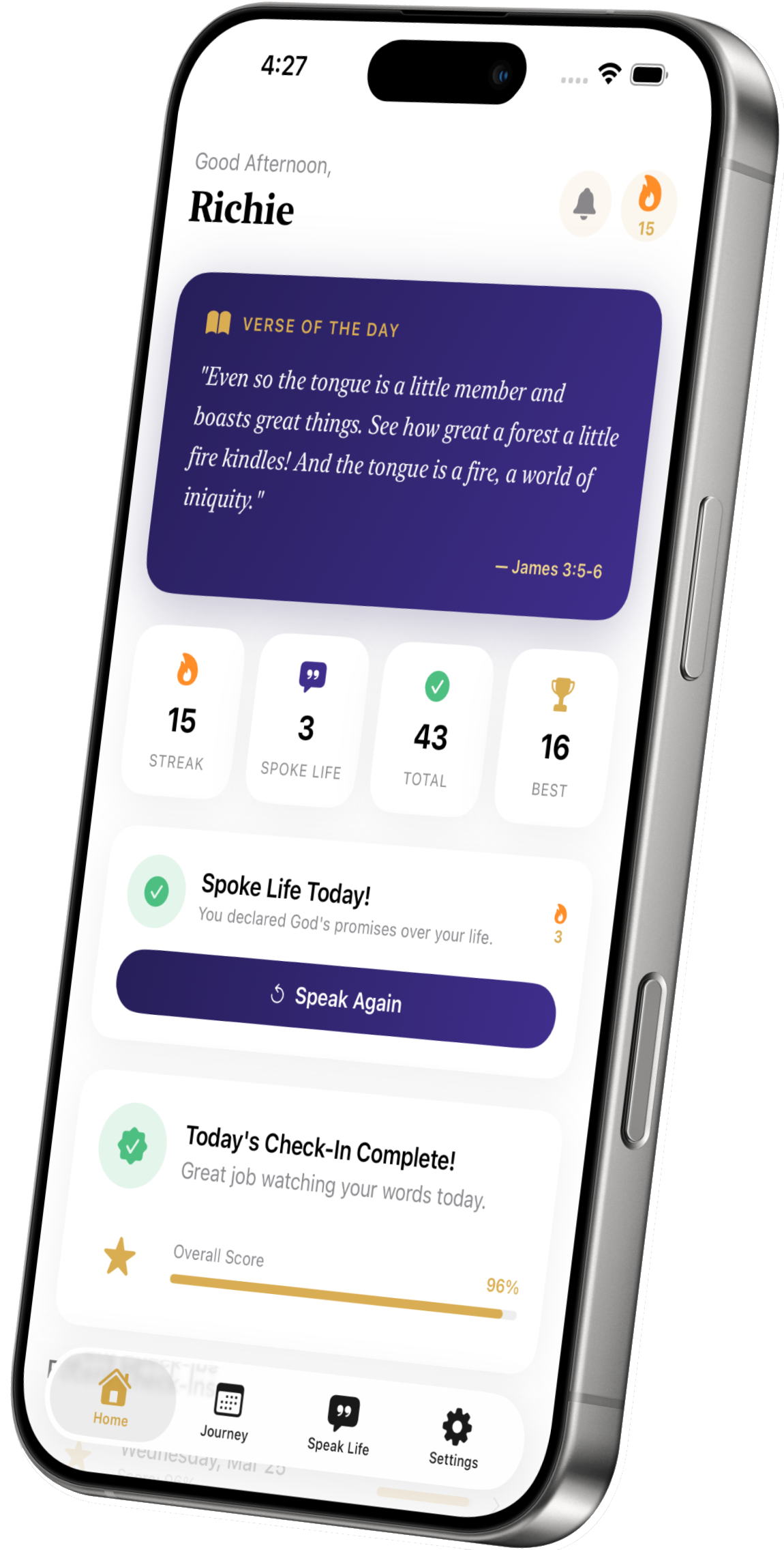 A fresh, power-of-words themed scripture greets you daily on your home screen — carefully curated from verses about the tongue, speech, and the power of declaration.